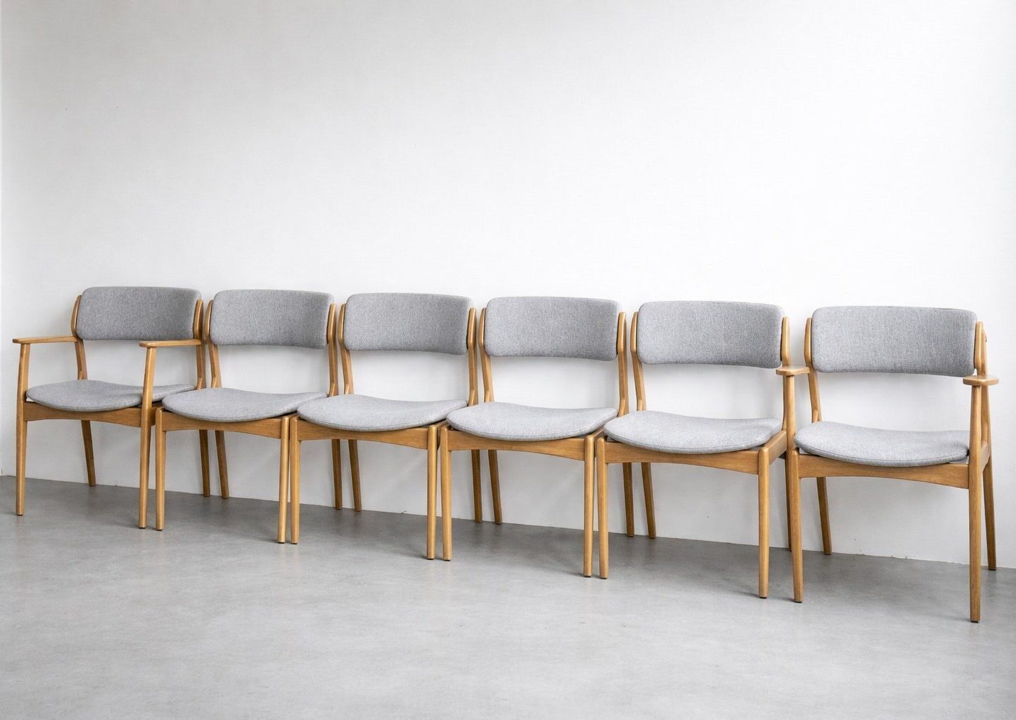 Set of six oak chairs, comprising four dining chairs Model 49 and two armchairs Model 50. Both feature Erik Buch’s signature curved “floating” seat, sculptural profile, and refined Danish Modern aesthetics. Newly upholstered in light grey fabric.