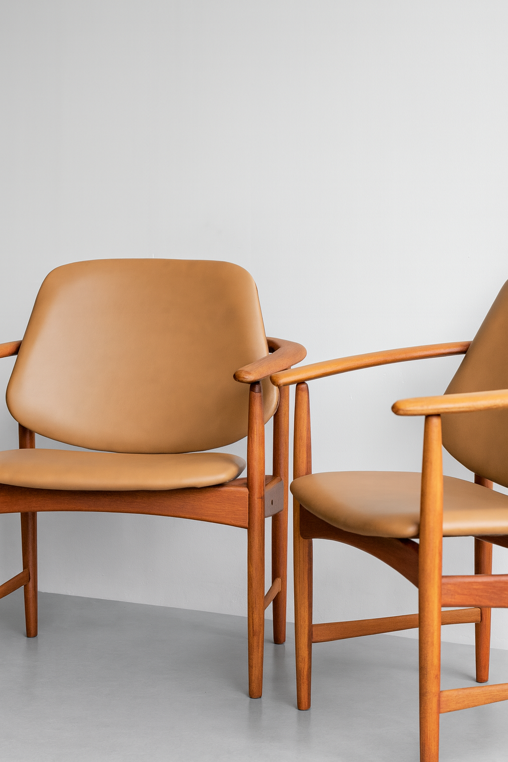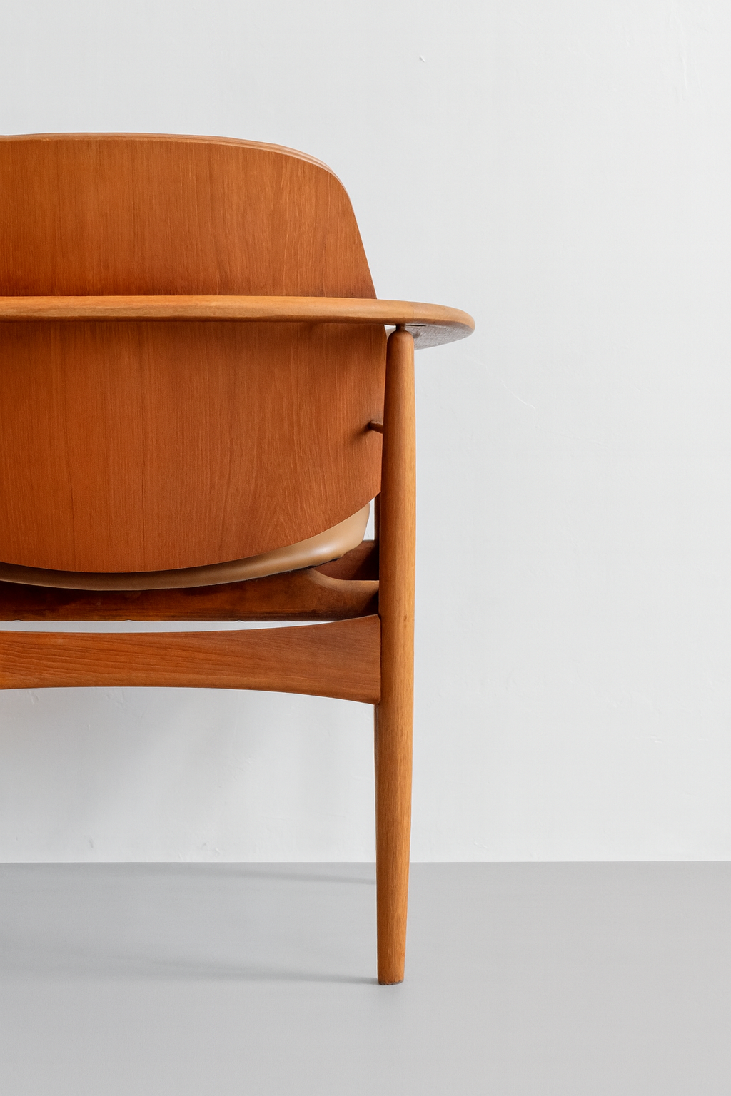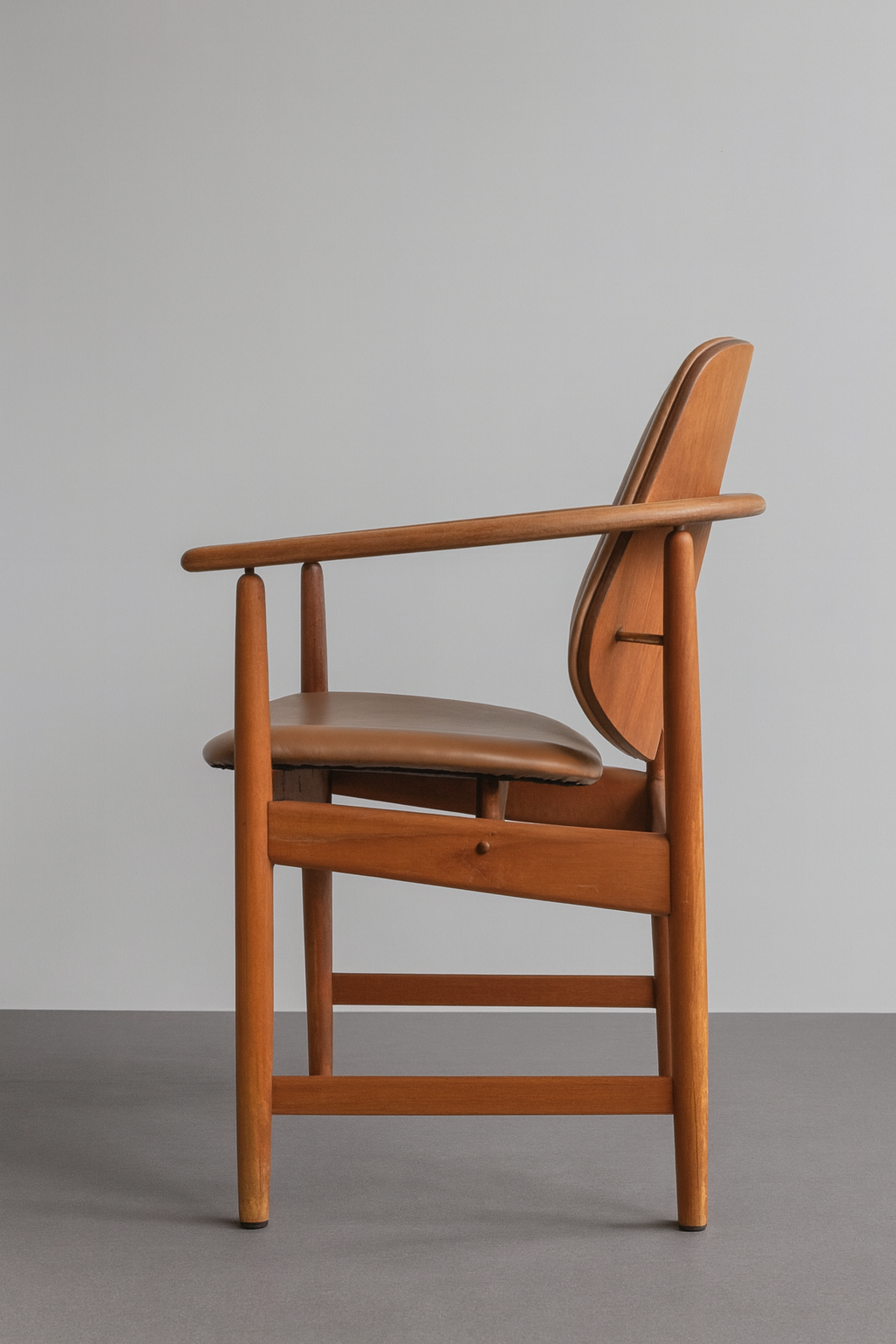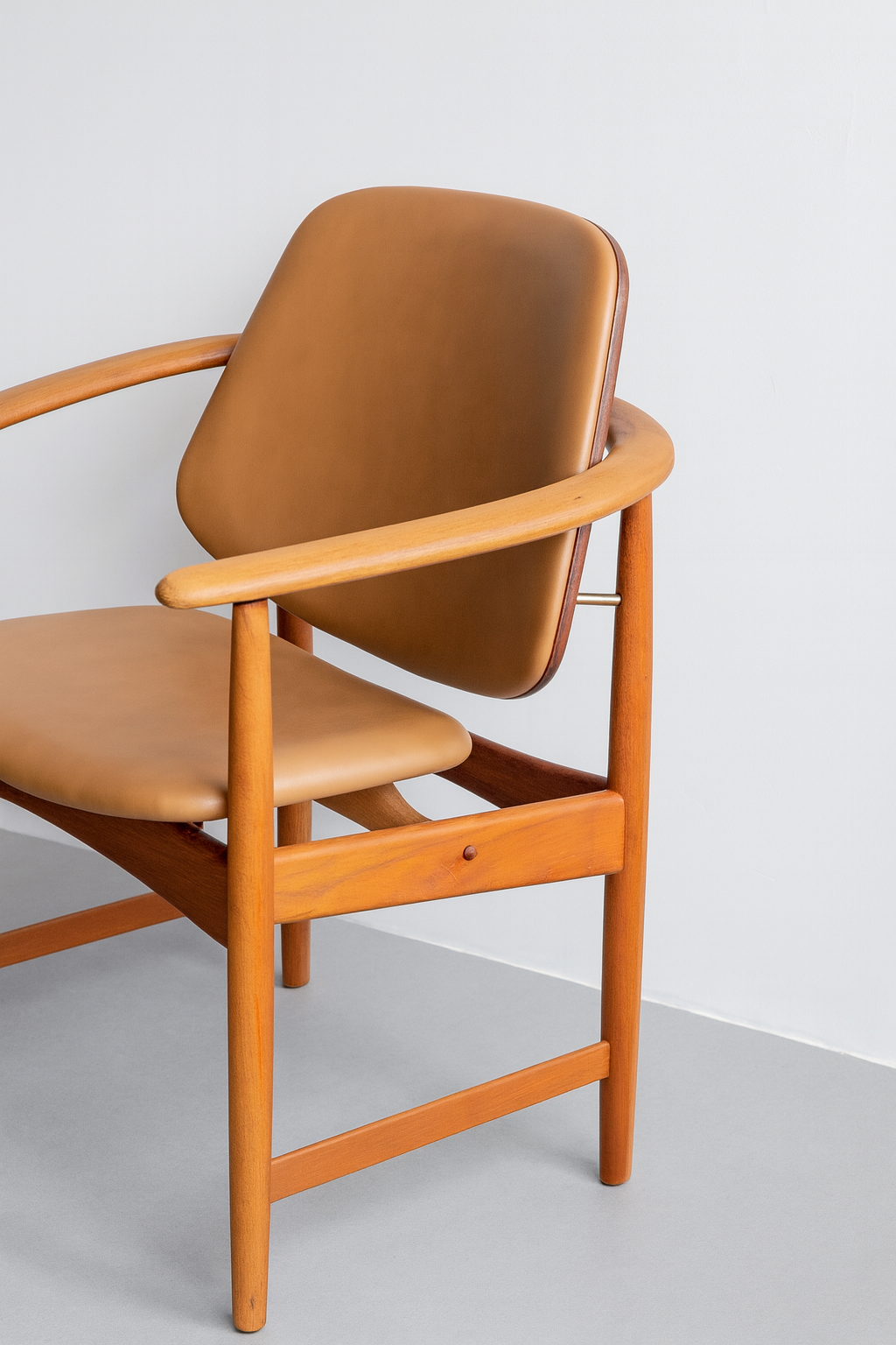 A rare and commanding design—often known as the “Captain’s” or “King’s” chair—this masterpiece by Arne Hovmand-Olsen is crafted from solid teak. The sculpted frame features sweeping armrests that flow seamlessly into the backrest, accented by refined brass details. A newly upholstered leather seat adds modern comfort to this example of timeless Danish craftsmanship.