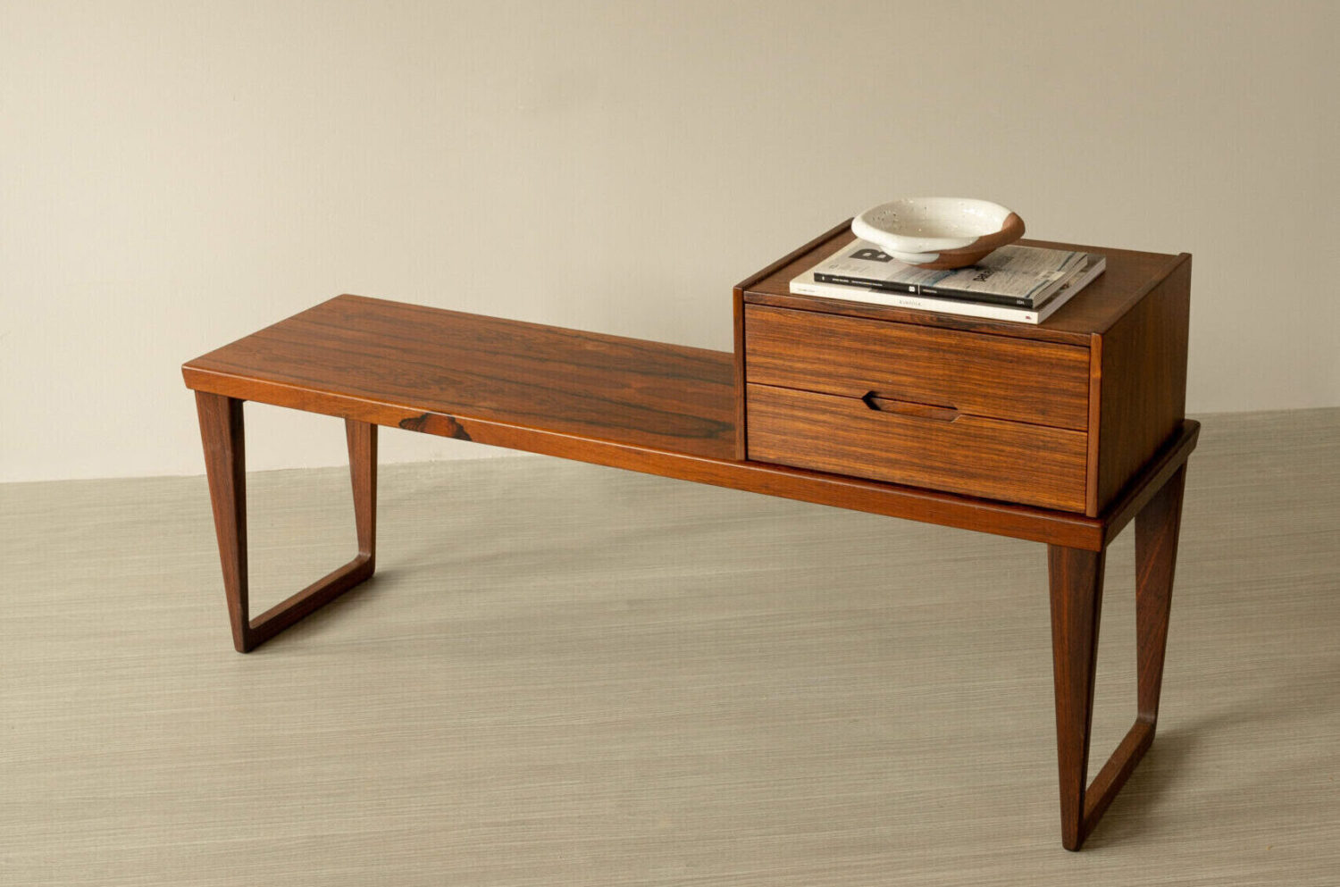 An iconic piece that needs no introduction. The Model 36 bench and model 32 modular drawers  by Kai Kristiansen is a global favorite among collectors and design lovers. This bench features loose standing two-drawer unit which can be positioned anywhere along the bench surface. Its rich Rio rosewood grain patterns and sleek profile make it a visual feast. Boasting unmatched craftsmanship and timeless design, this multifunctional piece can serve as a bench, side table, or hall way