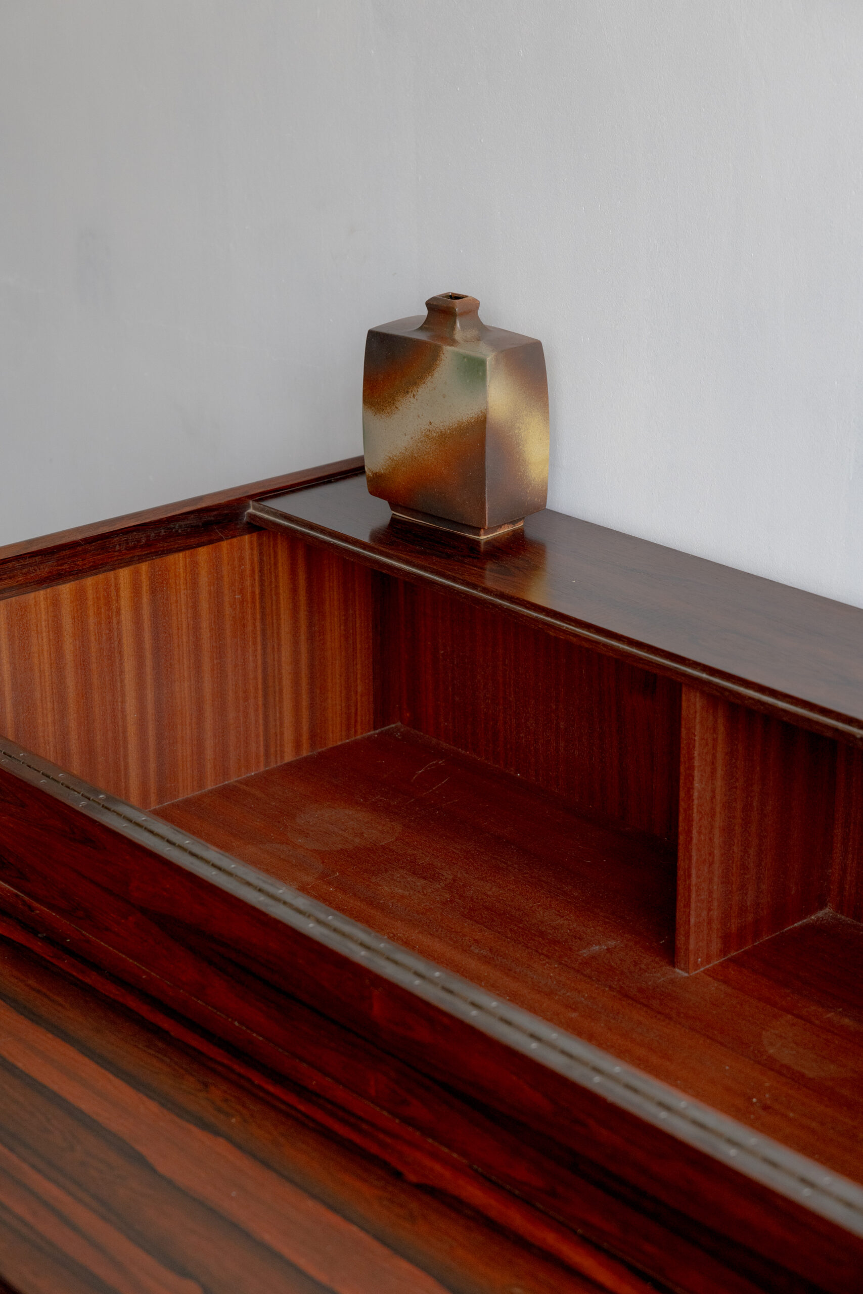This cabinet features a flip-top upper section designed as a dry bar, with spacious drawers below for additional storage. The small leather-inset handles complement its clean minimalist aesthetic, while the sled-style leg frame adds both visual lightness and stability. Beautifully constructed and impeccably detailed.
