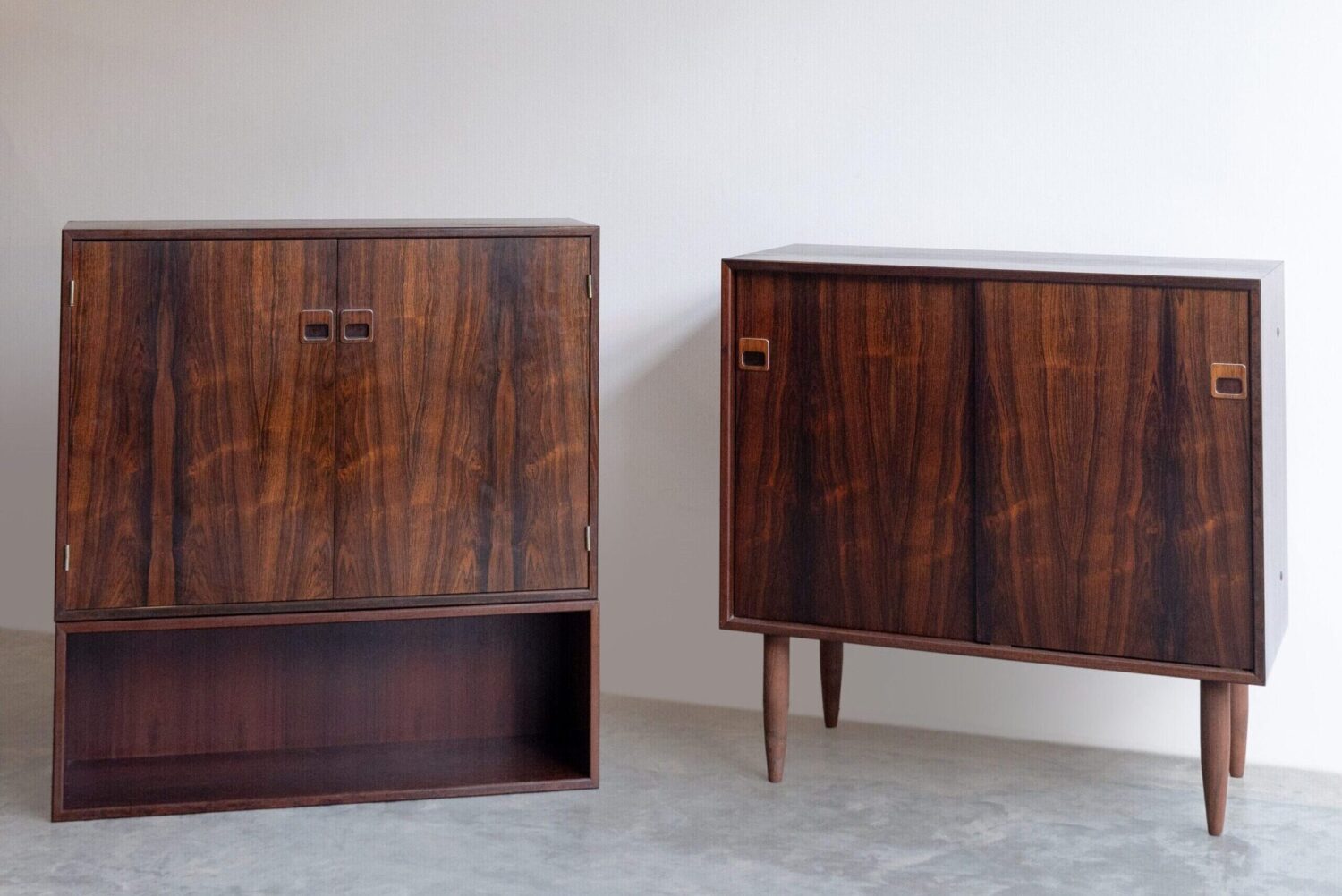 Deep, intense rosewood grains and hues throughout this versatile 3-part Hjørnebo System. A cabinet with sliding doors, adjustable internal shelves. The central recessed section includes dual doors leading to a mirrored bar area with integrated lighting. The top is an open shelf/display. The pieces can be reconfigured or used independently. Stands on round, tapered legs. Each cabinet unit has remarkable pulls with aluminum detailing.