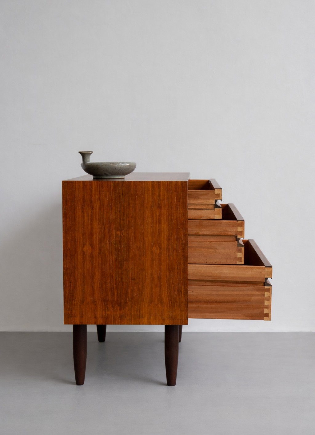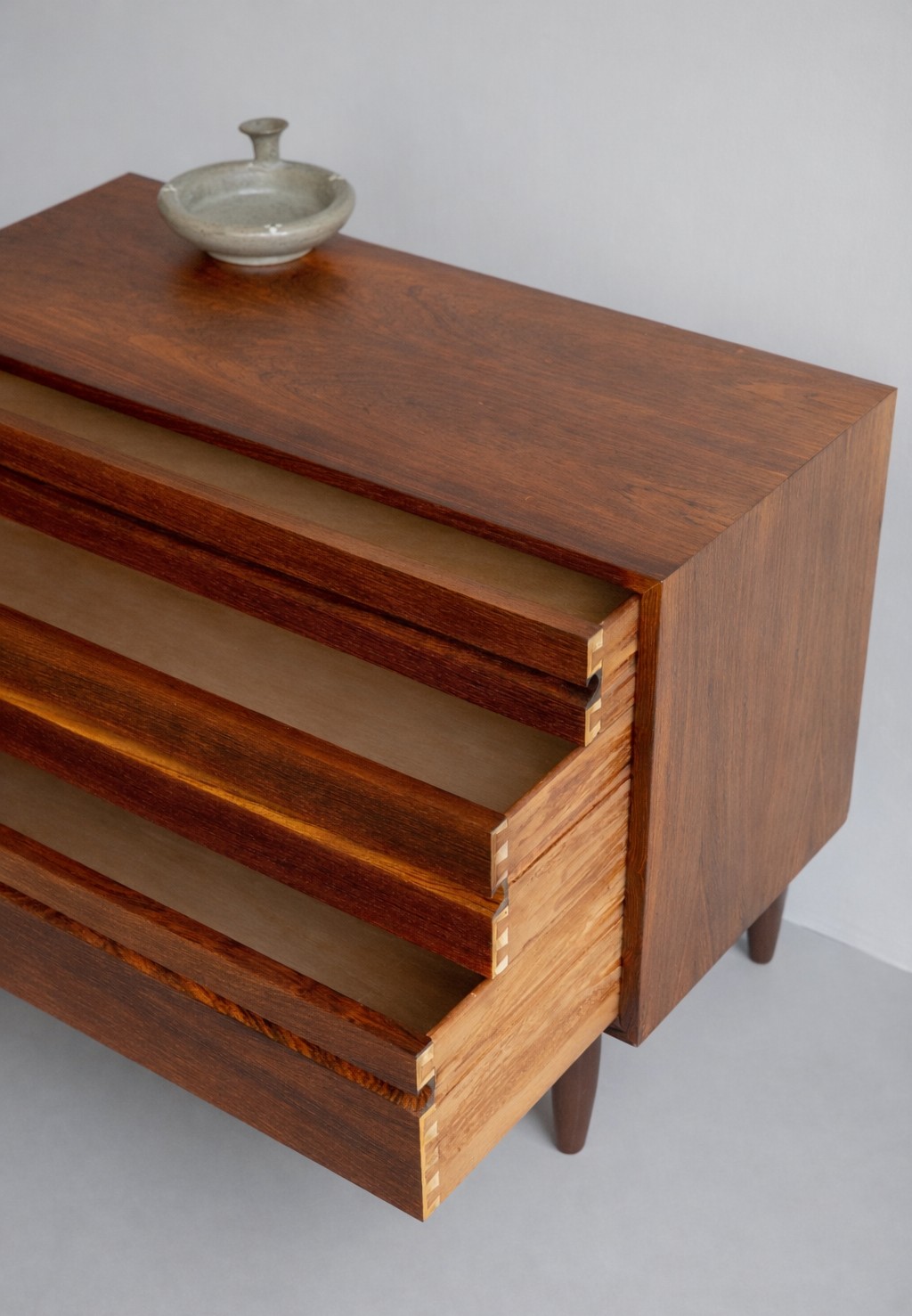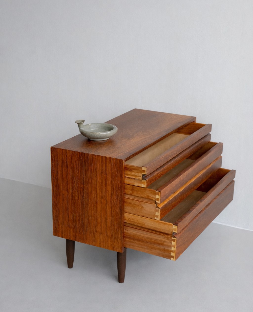 Danish modern chest designed by Poul Cadovius and produced by Cado, crafted in beautifully grained rosewood. The piece features three drawers of varying heights with integrated linear pulls, showcasing refined dovetail joinery and superb craftsmanship. Compact yet timeless, it displays rich rosewood grains and tones and stands elegantly on slender conical legs.